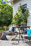 På bastuhuset klättrar en ’Wedding Day’-ros. Stolarna är loppisfynd som Anders har restaurerat.