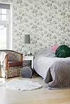 Jennies och Anders sovrum är romantiskt blommigt på såväl väggar som möbler. Fåtöljen är arvegods som har tapetserats om, hattasken är ett loppisfynd.