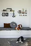 På hallens platsbyggda bänk har hundarna Evita och Tira uppsikt över huset.