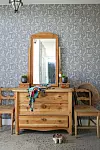 Framför hallens blommande tapet från Nordsjö står spegelbyrån som Jenny har ärvt och älskar – trots att lådorna knappt går att öppna.