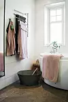 Det moderna badrummet får gammaldags charm med hjälp av loppisfyndad zinkbalja och korg.