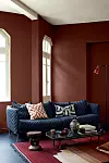 Här kontrasteras den varma färgskalan med en soffa i komplementfärgen blå. Foto Jotun
