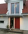 Här ger taket bra skydd över entrén till huset. Taket heter Veranda Hipped.