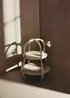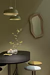 Designduon Front har skapat ett litet bord med två våningar som påminner om ett kakfat. Benen i böjträ består av av virke som blivit över från tillverkningen av Laminofåtöljen. Samma material utgör även ramen på spegeln som liknar en skål.