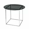 Lek med kontrasterna, rund skiva i rökfärgat glas och kubformat stativ i blank metall, diam 56 cm, h 45 cm, 3 600 kr, Broste.