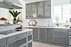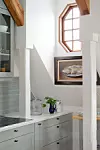 4. Låt ditt porslin och dina glas synas. Vitrinskåp med glas är på väg tillbaka i köket. Här har det utrustats med glas som dekorerats med ränder för en mer uppdaterad känsla. Ränderna går igen i köksluckornas räfflade ytor.