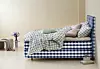 – Ganska fritt genom att anspela på proportioner och blandningar av material och färger. Det var också självklart för mig att mina mönster skulle kännas rätt både till den ikoniska Hästens-rutan i blått och vitt och till andra färgkombinationer på rutan.