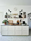 Köket består av Ikeaskåp med trädörrar som Anette har rollat i en mild vit färg. Öppna hyllor ger fint liv.