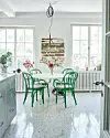 Det ombyggda köket blev av med en vägg och försågs med köksbänkar i rostfritt. Trägolvet är lackat och stänkmålat, både fint och praktiskt då eventuella fläckar "försvinner". De gröna karmstolarna är gamla "Öglan" från Ikea. Taklampa, Jonas Bohlins "Kvist" för Örsjö Belysning.