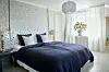 I sovrummet har Anette tillverkat en smart sänggavel av sitt eget tyg upphängt i remmar. Även kuddar och gardiner är egen produktion.