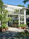 Den inglasade entrén tjänar som vinterträdgård och stilfullt vedförråd. Snyggt och praktiskt.