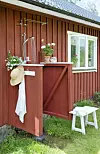 Den här uteduschen är byggd utmed husets fasad, genom att fästa skärmar på väggen får man en avskiljd dusch. Dessa är inmålade i falu rödfärg för att passa in i husets fasad. Här fanns det en stenhäll precis där duschen skulle vara. Har du inte samma tur – lägg marksten eller en trätrall som underlag.