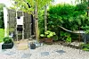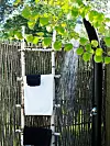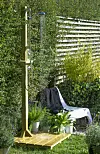Den här uteduschen har vägar av flätat pil och själva duschen värmer upp vattnet med hjälp av solenergi. På så sätt kan du koppla på trädgårdsslangen och låta solen göra jobbet.
