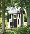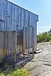 Knappt synlig. Uteduschen är väl integrerad med stugan. Se byggbeskrivning nedan.