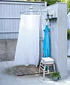 Även denna dusch har en behållare för soluppvärming av vattnet. Här har man satt duschdraperier som flexibla väggar för att ge insynsskydd och en trätrall som golv i duschen.