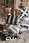 Kuddfodral till vänster uppifrån och ned: Iman 600 kr, Empress 600 kr, Nordic Stribe Futon 475 kr, Symetry 450 kr, Toile 280 kr. Kuddfodral till höger uppifrån och ned: Medina 450 kr, Jewel 600 kr, Tiny Mirror 750 kr, Bold Flower 350 kr, Artzy 1195 kr, Nordic Stribe 350 kr.