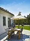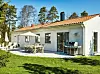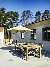 Det finns plats för både vila och umgänge på terrassen. Matbord i teak, Brafab. Stolar och parasoll, Formlagret.