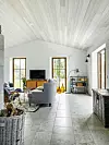 Huset präglas av en härlig rymd tack vare att taket är öppet i nock, på det högsta stället är takhöjden 3,15 meter. Taket är klätt med vitalaserad så kallad gotlandspanel i fallande längder. Golvet av Norrvangekalksten kommer från Slits Stenhuggeri på norra Gotland och är skönt att gå på tack vare vattenburen golvvärme.