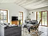 Fönster i tre väderstreck gör att allrummet badar i ljus. Soffa ”Petito” och fåtöljer ”Zoe”, Furninova, soffbord i marmor, Torkelson, rottinggungstol och tv-bänk, av Alf Svensson för Bjästa möbelsnickeri, är auktionsfynd. Mattan är en antik beni ourain från Marocko.