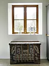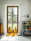 De höga gavelfönstren fångar den fina utsikten över stenmur, enar och slån. Gamla damejeanner med insatser för stearinljus fångar ljuset i fönstret. Rullvagn, Ellos, golvlampa, Ikea.