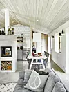 Braskaminen och matplatsen delar av vardagsrumsdelen och köket i allrummet. Matbord från Torkelson, stolarna är fyndade ”Lilla Åland” som lackerats om. Taklampa, Ernst. Soffkudde med fredssymbol från House Doctor.
