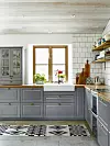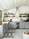 Väggen i köksdelen är kaklad i enkelt 15x15 cm vitt kakel satt i halvförband med mörkgrå fog. Ekhyllor på svarta järnkonsoler ersätter överskåp. Köket är Ikeas ”Bodbyn” med skålhandtag i matt mässing från Beslag Design. Spis Electrolux. Bomullsmatta, Åhléns.
