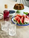Uppdukat för gofika en solig sommardag. Litet fat på fot Potteryjo, karaff Stelton, glas Spiegelau.