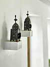 Sex inmurade vägghyllor fungerar som hållare för små marockanska ljuslyktor som sprider ett fint mönster på väggarna när de är tända.