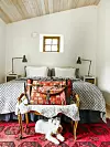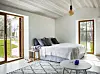 I gästhuset finns förutom dubbelsäng också en bäddsoffa om gästerna blir många. Från sängen skymtar man havet. Det handvirkade överkastet är inköpt på auktion. Sängkappa, Ellos, sänglampa ”Followme” från Marset, soffbord, Jotex, matta Ellos.