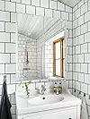 I duschrummet är väggarna klädda med samma enkla kakel som i köket. Kommod och spegelskåp från Ikea, blandare, Damixa.