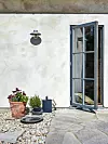 I väntan på mer tid för odling får det bli krukträdgård i det lilla formatet. Terrakottakruka från Växthuset Linds i Visby, vattenkanna Ikea, Signe Persson-Melins fågelbad ”Snäcka” i gjuten aluminium, Byrarums Bruk. Vägglykta ”Mani”, Konstsmide.