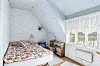 Sovrum med snedtak på övervåningen. Foto: Fastighetsbyrån i Norrtälje