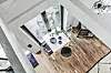 Lägenheten har högt i tak och bra ljusinsläpp tack vare glasdörrar och ett takfönster på loftet. Foto: Erik G /se360 Styling: BjurforsHome