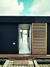 Foto: Anders Hvid Ingången till husbåten är tillverkad i underhållsfri teak och takpapp.