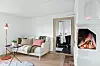 Vardagsrum med trägolv och öppen spis. Foto: Diakrit