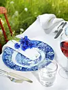• Det härliga med midsommar är att man genom att plocka i skåp och förråd bland porslin och skålar lätt skapar en klassisk midsommarkänsla. Allt går att mixa, porslin, glas och bestick. Se bara till att blandningen är balanserad, så att det inte bara är ett kuvert som har en annan stil eller uppsättning porsliin. Byt då hellre ut hälften av kuverten så kan du duka udda porslin varannat kuvert.