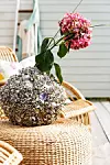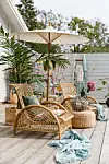 På uteplatsen får växterna ofta utstå både torka, stark sol och mycket regn. Ett alternativ för den som hellre njuter i vilstolen än pysslar i trädgården är att addera konstgjorda växter. Rottingfåtöljer,  "Paris Chair", av Arne Jacobsen, Sika Design, Rottingpuff,  Dixie. Parasoll,  Affari. Stor vas av sjötulpaner, Love Warriors. Mönstrade kuddar "Teheran",  Svenskt Tenn. Grön kudde med palm, Welcome Home. Blå pläd,  Affari. Ballerinasko,  Deuxième Studios. Solglasögon, Izipizi, .