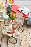 Solbädd,  Svenskt Tenn. Drinkvagn,  Syster Lycklig. Fiskkaraff,  Welcome Home. Matta, Affari. Vinglas i plast,  Boxinbag. Mönstrade kuddar "Teheran", Svenskt Tenn. Rosa glasask,  Åhléns. Kapsylöppnare "krokodil", Hemtex. Blå vas, Lindform. Tyg, Svenskt Tenn.