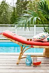 Poolens turkosa färg i kombination med hallonrött förstärker sommarkänslan. Solbädd, , Svenskt Tenn. Fiskkaraff,  Welcome Home. Solglasögon, Izipizi. Mönstrade kuddar "Teheran", Svenskt Tenn.