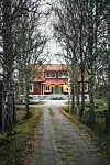 För att komma till gården åker man genom en vacker björkallé. Huset har fått behålla sin röda originalkulör.