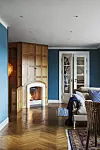 Sällskapsrummet på övervåningen har en eldstad med samma ekpanel som löper längs väggarna i trapphuset. Jeansmattan i bortre delen av rummet kommer från lokala väveriet Loppberga.
