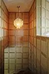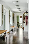 Den generösa entréhallen har sittbänkar snickrade av en lokal hantverkare. Väggarna är tapetserade med ”Golden Lily” från William Morris. Det öländska kalkstensgolvet kommer från Sjöströms.