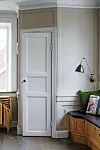 I bortre delen av köket finns ett inbyggt skafferi och en sittbänk med förvaring. Vägglampa, Bestlite, prydnadskudde från Svenskt Tenn. Pallar, Ikea.
