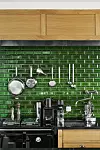 Grönt kakel, Fired Earth, bänkskivan i svart granit kommer från ett lokalt sten­huggeri, Aga-spis, Rayburn. Den generösa hängaren för köksverktyg kommer från Dornbracht. Salt- och pepparkvarnar, Peugeot.