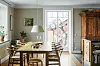 De flesta väggar i huset har paneler, antingen från golv till tak, eller golvpaneler. I köket har panelerna målats i en varm beige kulör som är fin mot golv och möbler i oljad ek. Bordet har paret ritat själva och låtit bygga. De klassiska ”Y”-stolarna av Hans J Wegner och lampan ”Romeo Moon” kommer båda från Flos. På väggen i bakgrunden syns ett gammalt flygfoto över gården.