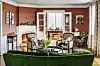 Vardagsrummet ligger mitt i huset i anslutning till hall, bibliotek och kök samt med dubbeldörrar mot altanen. Välvd soffa, Englesson, klädd i sammetstyg från Tricia Guild, omtapetserade fåtöljer, Bukowskis Market, och brickbord, Svenskt Tenn. Den lilla sittpuffen från Svenskt Tenn är klädd i det klassiska elefantmönstret av Estrid Ericson. I den högra fåtöljen myser katten Zelda. Tulpaner i Alvar Aalto-vas från Iittala. Golvlamporna i bortre delen av rummet kommer båda från Svenskt Tenn och läsfåtöljen är ett loppisfynd omklätt i William Morris ”Golden Lily”. I biblioteket syns skrivbordet som paret köpt på en auktion. Väggarna är målade med ”Pompeian Red” från Fired Earth.
