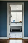 Från sällskapsrummet på övervåningen, målat i ”Stone Blue” från Farrow & Ball, kommer man in i badrummet. Badkar med tassar, Byggfabriken, blandare från Dornbracht.