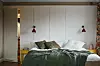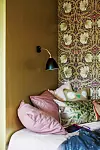 I master bedroom är klädförvaringen en walk-in-closet bakom en väggpanel som i sin tur blir en sänggavel. Vinröda sänglampor, Bestlite, gula sängbord, Ikea, och stormönstrat blommiga gardiner, GP & J Baker. Överkast, H&M Home, de gröna kuddarna är loppisfynd.