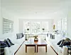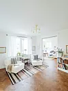 Vardagsrummet har ett rejält ljusinsläpp. Soffa och fåtöljer från Room. Kuddar och plädar från Lexington.