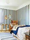 Gästsovrum med randig tapet från Lexington och fåtölj inropad på Stockholms auktionsverk. Det runda bordet har Kristinas farfar tillverkat.